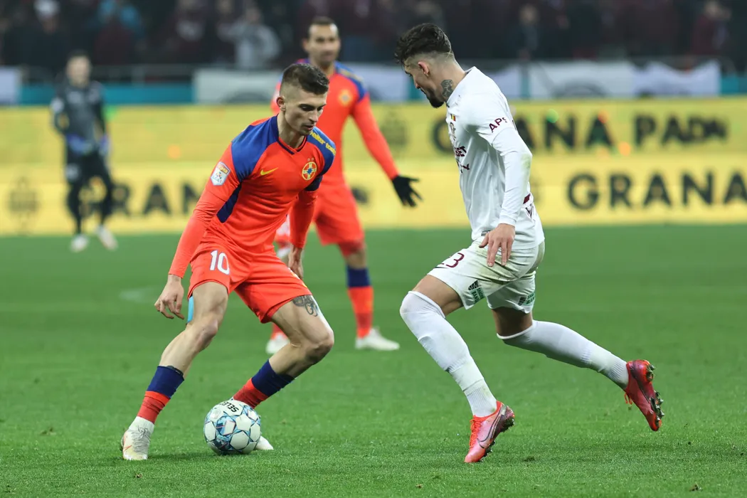 Florin Tanase (S), de la FCSB, lupta pentru balon cu Alexandru Albu (D), de la Rapid, in meciul de fotbal din etapa a XX-a a Ligii 1, disputat pe Arena Nationala din Bucuresti, miercuri, 15 decembrie 2021. GEORGE FILIP / MEDIAFAX FOTO