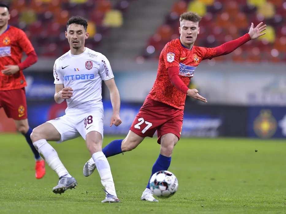 Nicolae Carnat si Darius Dumitru Olaru cu ochii inchisi in meciul de fotbal dintre FCSB si CFR Cluj, contand pentru Liga 1 Casa Pariurilor, desfasurat fara spectatori pe Arena Nationala din Bucuresti, vineri 19 martie 2021. © FOTO:Razvan Pasarica/SPORT PICTURES