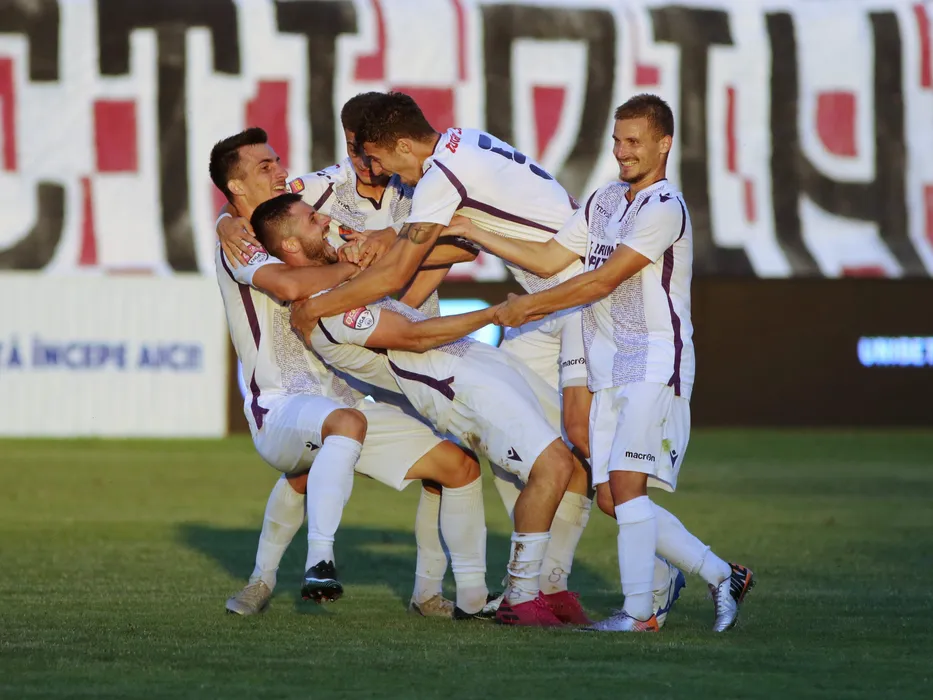 Jucatorii formatiei FC Arges isi reactioneaza la finalul meciului de fotbal dintre Rapid Bucuresti si FC Arges din etapa 3 a play-off-ului Ligii 2, disputat pe stadionul Regie din Bucurestii, marti, 21 iulie 2020.© FOTO:Sport Pictures