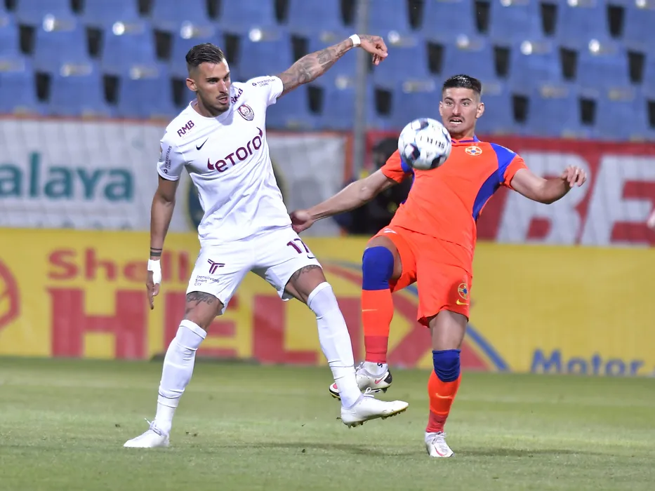 Marko Dugandzic si Iulian Lucian Cristea in meciul de fotbal dintre FCSB si CFR Cluj, contand pentru Play-off-ul Ligii 1 Casa Pariurilor, desfasurat pe Stadionul Gloria din Buzau, duminica 22 mai 2022. © FOTO:Razvan Pasarica/SPORT PICTURES