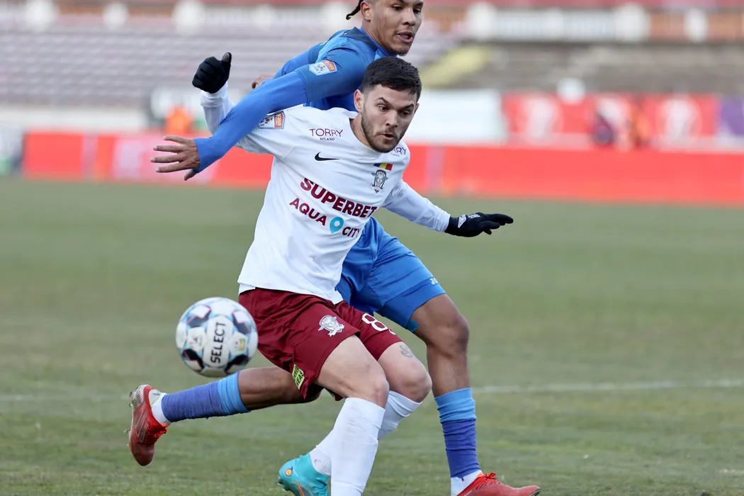 Alexandru Ionita si Jeremy Corinus lupta pentru posesia balonului in timpul partidei dintre Academica Clinceni (echipament bleu) si Rapid, partida disputata in etapa a doua din play-off-ul Ligii 1 de fotbal, sambata, 19 martie 2022, pe stadionul din Clinceni, Ilfov. GEORGE FLUSTER / MEDIAFAX FOTO