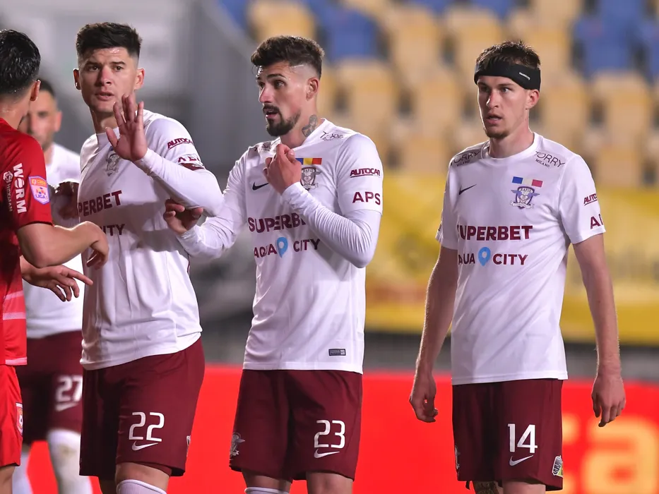 Fotbalistii rapidisti Cristian Ionut Sapunaru, Alexandru Cristian Albu si Mattias Kait in meciul de fotbal dintre Chindia Targoviste si Rapid Bucuresti, contand pentru Play-out-ul Ligii 1 Casa Pariurilor, desfasurat pe Stadionul Ilie Oana din Ploiesti, vineri 29 aprilie 2022. © FOTO:Razvan Pasarica/SPORT PICTURES