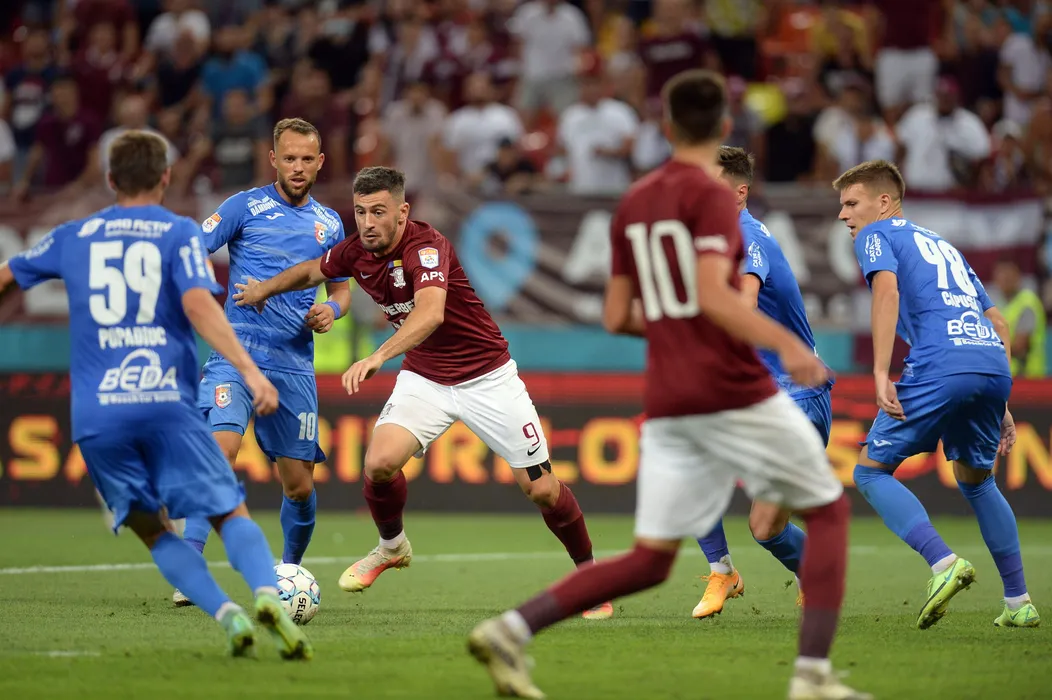 Adrian Balan (C), de la Rapid, suteaza in timpul meciului de fotbal contra echipei Chindia Targoviste din prima etapa a Ligii 1, disputat pe Arena Nationala din Bucuresti, duminica, 18 iulie 2021. EDUARD VINATORU / MEDIAFAX FOTO