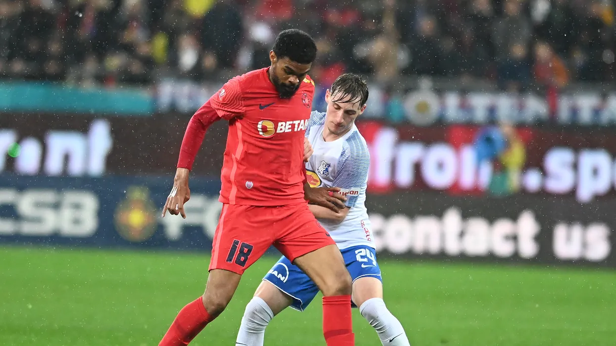 Sylas Laouari Edjouma Malcom si Constantin Grameni in meciul de fotbal dintre FCSB si Farul Constanta, contand pentru Play-off-ul Superligii Superbet, desfasurat pe Arena Nationala din Bucuresti, luni 17 aprilie 2023. © FOTO:Razvan Pasarica/SPORT PICTURES