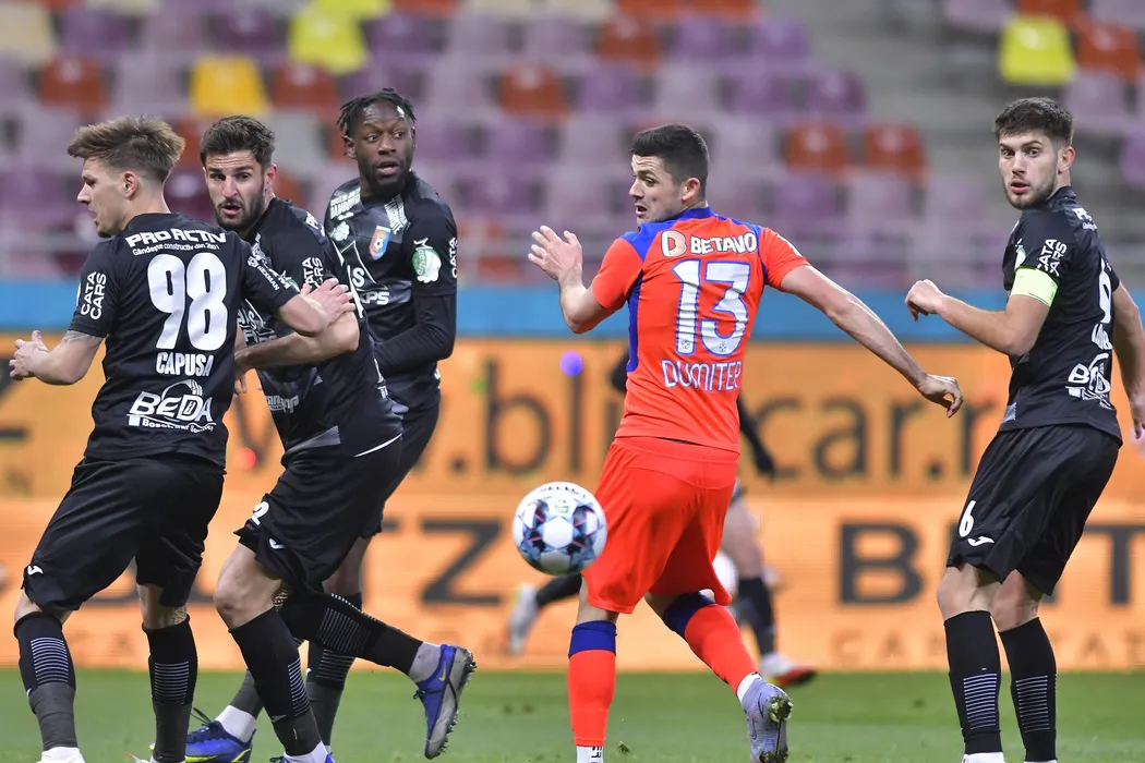 Tiberiu Ionut Capusa, Ovidiu Andrei Pitian, Richard Steven Sila, Ioan Andrei Vasile Dumiter si Marco Alexandru Dulca in meciul de fotbal dintre FCSB si Chindia Targoviste, contand pentru Liga 1 Casa Pariurilor, desfasurat pe Arena Nationala din Bucuresti, duminica 13 februarie 2022. © FOTO:Razvan Pasarica/SPORT PICTURES
