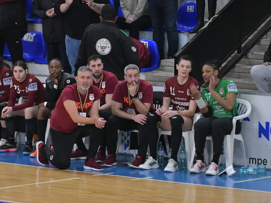 Carlos Viver alaturi de Gabriela Perianu si Julie Line Foggea pe banca rapidista la meciul de handbal feminin dintre SCM Gloria Buzau si Rapid Bucuresti, contand pentru Liga Florilor, desfasurat in Sala Sporturilor Romeo Iamandi din Buzau, sambata 19 februarie 2022. © FOTO:Razvan Pasarica/SPORT PICTURES