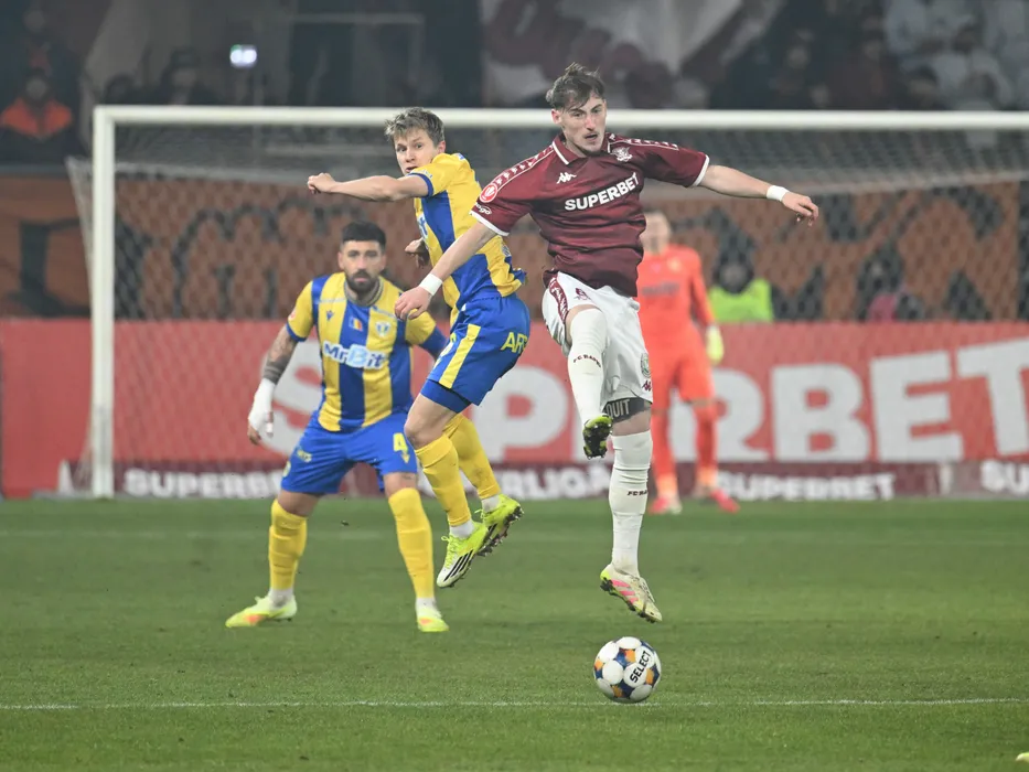 Tommi Matti Jyry si Constantin Grameni in meciul de fotbal dintre Rapid Bucuresti si Petrolul Ploiesti, din cadrul Superligii Superbet, desfasurat pe Superbet Arena-Giulesti din Bucuresti, vineri 6 februarie 2026. © FOTO:Razvan Pasarica/SPORT PICTURES