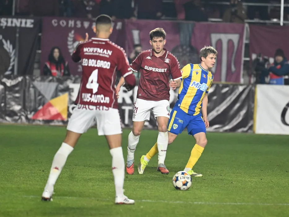 Robert Ionut Salceanu si Tommi Matti Jyry in meciul de fotbal dintre Rapid Bucuresti si Petrolul Ploiesti, din cadrul Superligii Superbet, desfasurat pe Superbet Arena-Giulesti din Bucuresti, vineri 6 februarie 2026. © FOTO:Razvan Pasarica/SPORT PICTURES