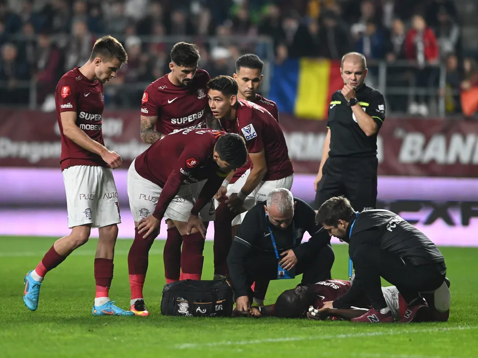 Fotbalistii rapidisti Mattias Kait, Alexandru Cristian Albu, Antonio Valentin Sefer, Morais Junior Iraneuton Sousa si Cristian Ionut Sapunaru alaturi de Kevin Luckassen aflat sub ingrijiri medicale in meciul de fotbal dintre Rapid Bucuresti si CFR Cluj, contand pentru Superliga Superbet, desfasurat pe Stadionul Rapid Giulesti din Bucuresti, duminica 30 octombrie 2022. © FOTO:Razvan Pasarica/SPORT PICTURES