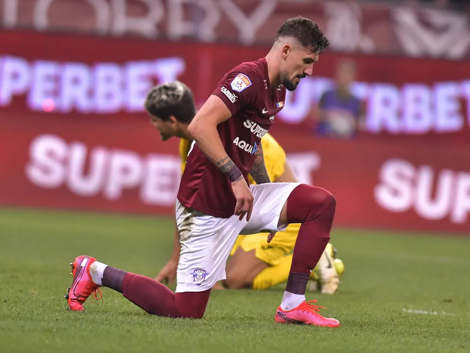 Alexandru Cristian Albu in genunchi in meciul de fotbal dintre Rapid Bucuresti si Gaz Metan Medias, contand pentru Liga 1 Casa Pariurilor, desfasurat pe Arena Nationala din Bucuresti, vineri 17 septembrie 2021. © FOTO:Razvan Pasarica/SPORT PICTURES