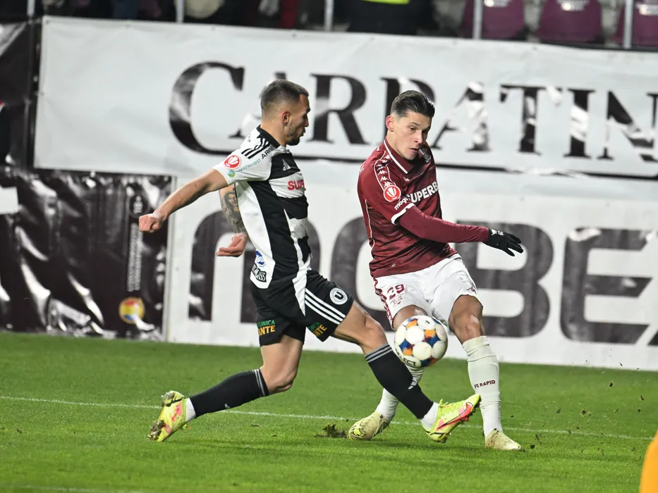 Mihai Alexandru Dobre si Dino Mikanovic in meciul de fotbal dintre Rapid Bucuresti si Universitatea Cluj, din cadrul Superligii Superbet, desfasurat pe Superbet Arena-Giulesti din Bucuresti, sambata 31 ianuarie 2026. © FOTO:Razvan Pasarica/SPORT PICTURES