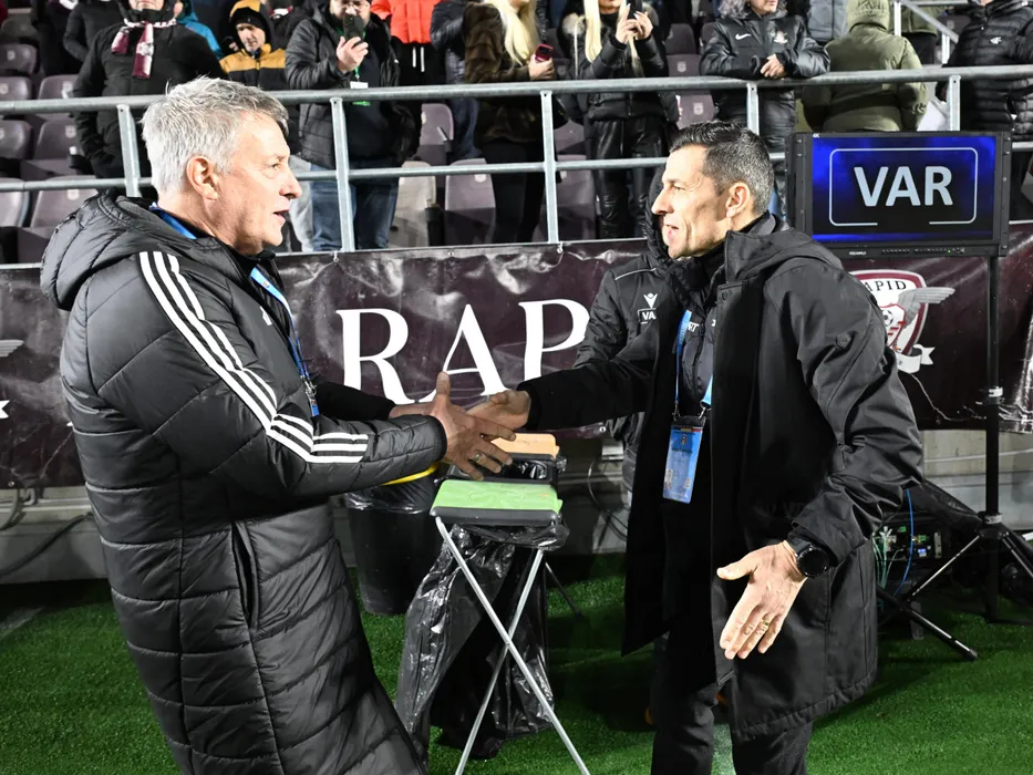 Antrenorii celor doua echipe Constantin Galca si Cristiano Bergodi se saluta inaintea meciului de fotbal dintre Rapid Bucuresti si Universitatea Cluj, din cadrul Superligii Superbet, desfasurat pe Superbet Arena-Giulesti din Bucuresti, sambata 31 ianuarie 2026. © FOTO:Razvan Pasarica/SPORT PICTURES
