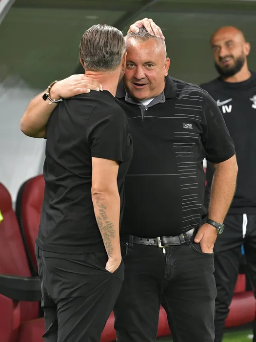 Adrian Matei se saluta cu Laurentiu Aurelian Reghecampf inaintea meciului de fotbal dintre Rapid Bucuresti si Universitatea Craiova, contand pentru Liga 1 Casa Pariurilor, desfasurat pe Arena Nationala din Bucuresti, sambata 28 august 2021. © FOTO:Razvan Pasarica/SPORT PICTURES