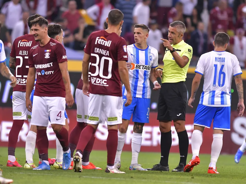 Arbitrul central Radu Petrescu alaturi de Alexandru George Cimpanu in meciul de fotbal dintre Rapid Bucuresti si Universitatea Craiova, contand pentru Liga 1 Casa Pariurilor, desfasurat pe Arena Nationala din Bucuresti, sambata 28 august 2021. © FOTO:Razvan Pasarica/SPORT PICTURES