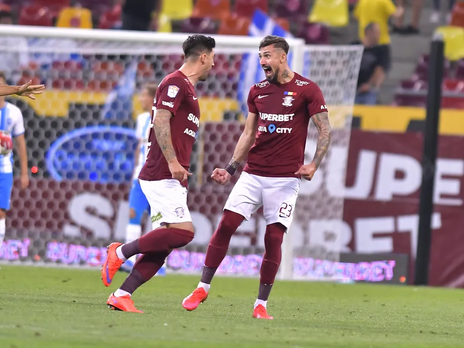 Alexandru Cristian Albu se bucura dupa un gol marcat alaturi de Cristian Ionut Sapunaru in meciul de fotbal dintre Rapid Bucuresti si Universitatea Craiova, contand pentru Liga 1 Casa Pariurilor, desfasurat pe Arena Nationala din Bucuresti, sambata 28 august 2021. © FOTO:Razvan Pasarica/SPORT PICTURES