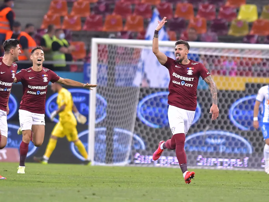 Alexandru Cristian Albu se bucura dupa un gol marcat alaturi de Cristian Ionut Sapunaru si Nicolae Carnat in meciul de fotbal dintre Rapid Bucuresti si Universitatea Craiova, contand pentru Liga 1 Casa Pariurilor, desfasurat pe Arena Nationala din Bucuresti, sambata 28 august 2021. © FOTO:Razvan Pasarica/SPORT PICTURES