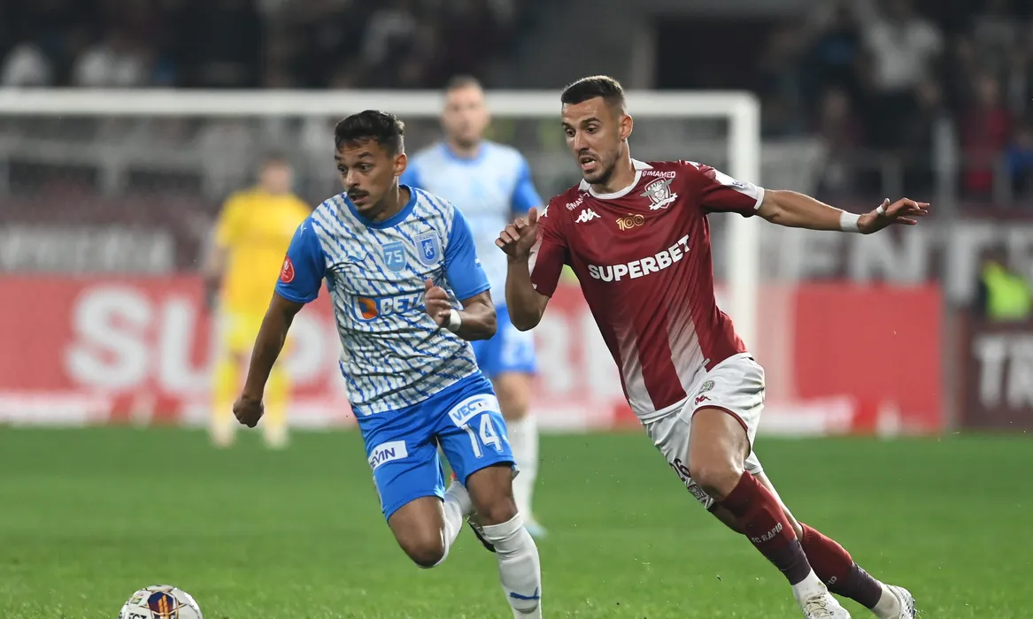 Lyes Hafid Houri si Razvan Constantin Oaida in meciul de fotbal dintre Rapid Bucuresti si Universitatea Craiova, din cadrul Superligii Superbet, desfasurat pe Superbet Arena-Giulesti din Bucuresti, duminica 29 octombrie 2023. © FOTO:Razvan Pasarica/SPORT PICTURES