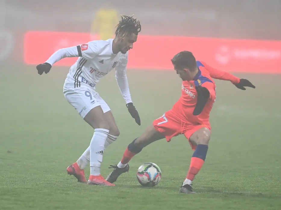 Virgile Jacky Marcel Pinson si Sorin Danut Serban in meciul de fotbal dintre FC Botosani si FCSB, contand pentru Cupa Romaniei Betano, desfasurat pe Stadionul Municipal din Botosani, luni 8 decembrie 2022. © FOTO:Razvan Pasarica/SPORT PICTURES