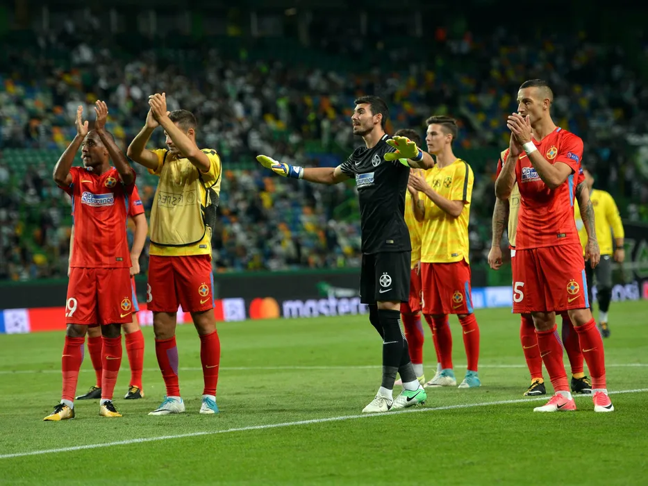 Fotbalistii stelisti William de Amorim,Florin Nita si Marko Momcilovic saluta galeria dupa meciul de fotbal dintre FC Steaua Bucuresti si Sporting Lisabona, contand pentru playoff-ul Ligii Campionilor, disputat marti 15 august 2017 pe stadionul Jose Alvalade din Lisabona. Razvan Pasarica/SPORT PICTURES