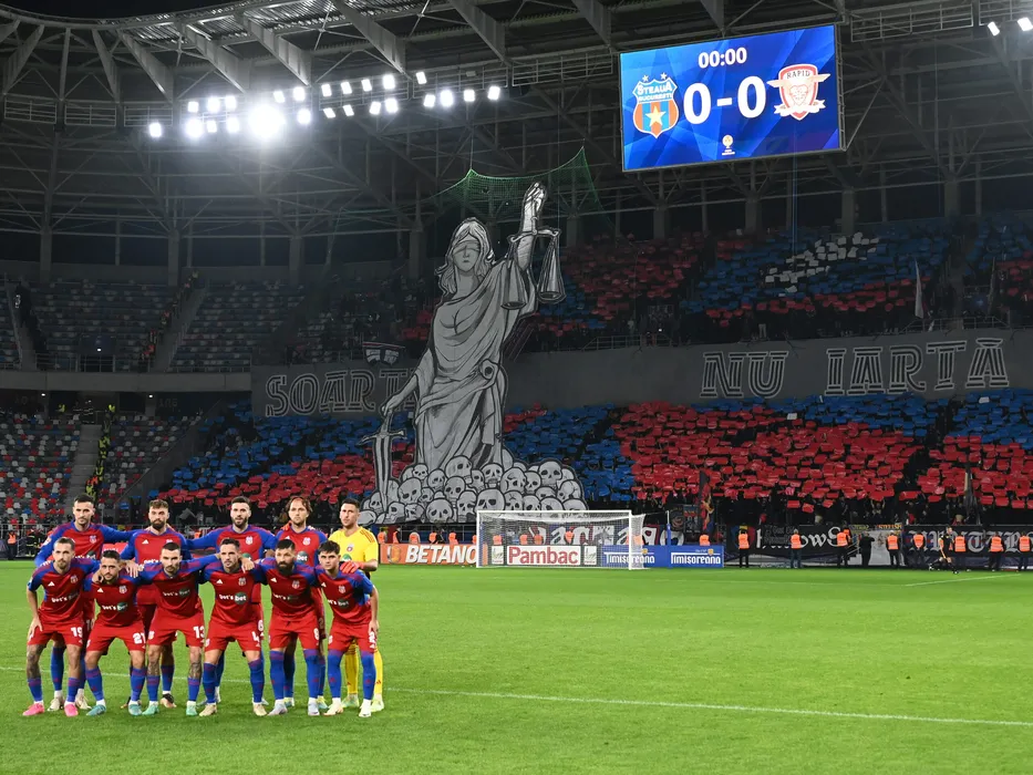 Fotbalistii stelisti la o fotografie de grup realizata alaturi de suportrei, tabela si coregrfaie inaintea meciului de fotbal dintre CSA Steaua Bucuresti si Rapid Bucuresti, contand pentru Cupa Romaniei Betano, desfasurat pe Stadionul Steaua-Ghencea din Bucuresti, miercuri 1 noiembrie 2023. © FOTO:Razvan Pasarica/SPORT PICTURES