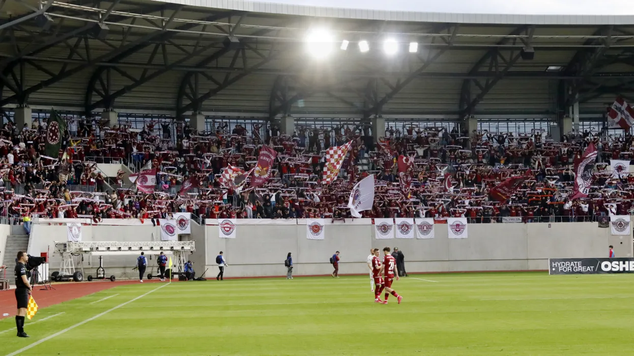 Galeria rapidista cu steaguri si fulare isi incurajeaza favoritii in meciul de fotbal dintre AFC Hermannstadt Sibiu si FC Rapid 1923 Bucuresti, contand pentru semifinala Cupei Romaniei Betano, desfasurat pe Stadionul Municipal din Sibiu, miercuri 23 aprilie 2025. © FOTO: Valentin Macrea/SPORT PICTURES