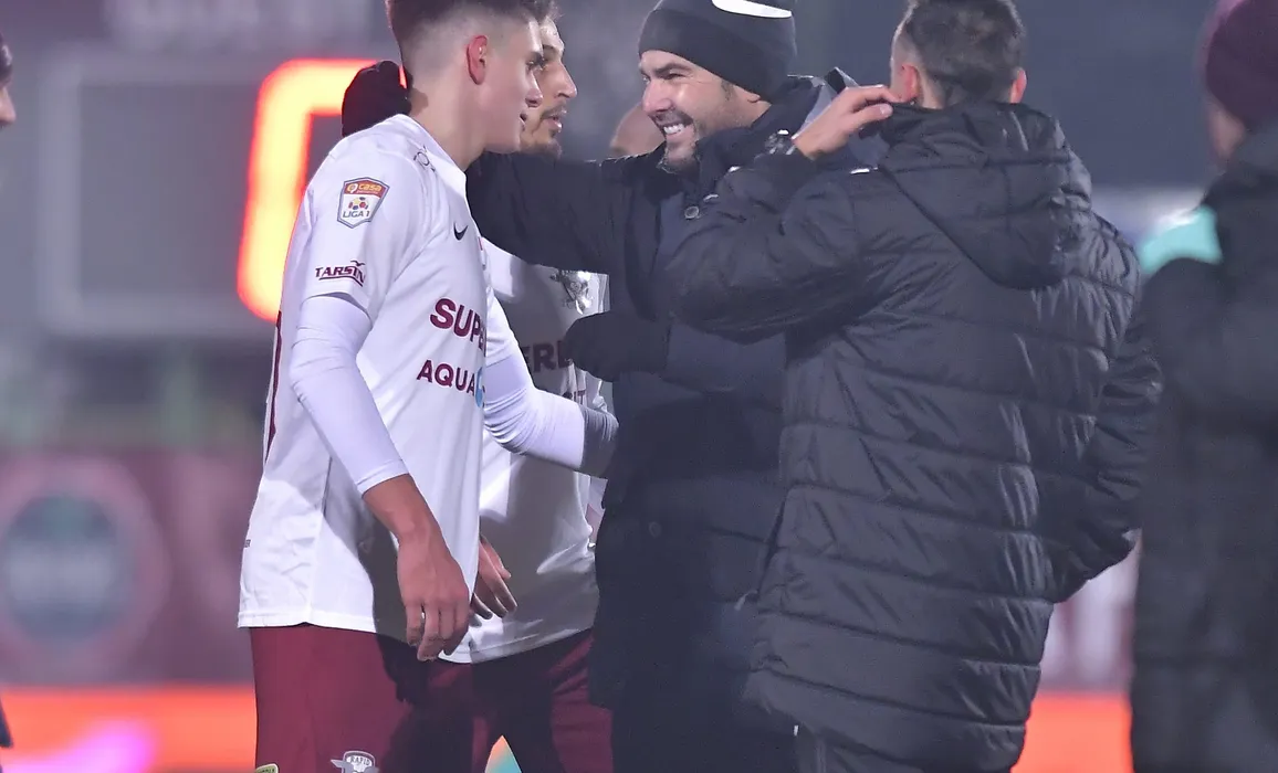 Adrian Mutu il felicita pe Rares Andrei Ilie dupa meciul de fotbal dintre Rapid Bucuresti si Academica Clinceni, contand pentru Liga 1 Casa Pariurilor, desfasurat pe Stadionul Orasenesc din Mioveni, sambata 5 martie 2022. © FOTO:Razvan Pasarica/SPORT PICTURES