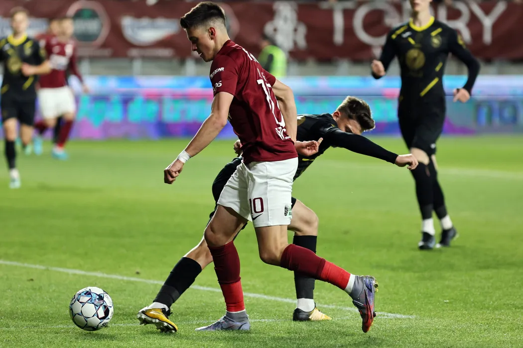 Rares Ilie (S), de la Rapid, suteaza in timpul meciului de fotbal contra echipei Gaz Metan Medias din etapa 5 a play-out -ului Ligii 1, disputat pe stadionul Giulesti-Valentin Stanescu, luni, 18 aprilie 2022. GEORGE FILIP / MEDIAFAX FOTO
