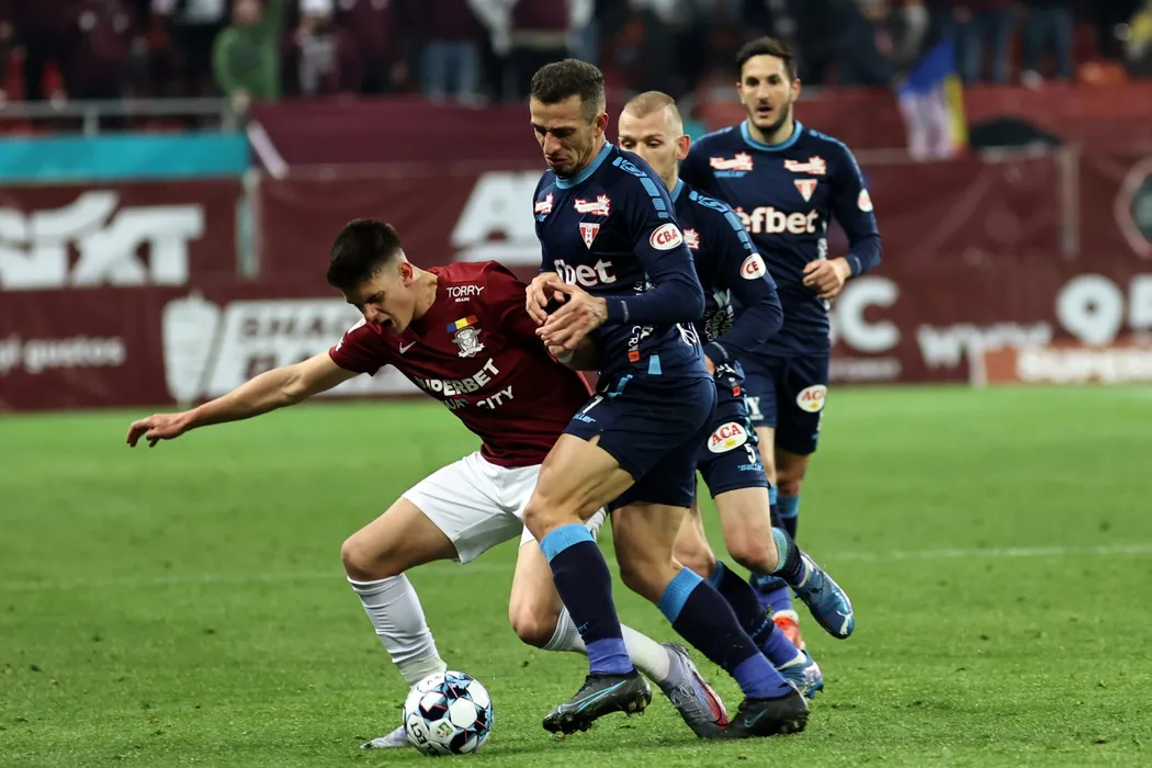 Rares Ilie (S), de la Rapid, lupta pentru balon cu Roger Figueira (D), de la UTA Arad, in meciul de fotbal din etapa a XXIII-a a Ligii 1, disputat pe Arena Nationala din Bucuresti, sambata, 29 ianuarie 2022. GEORGE FILIP / MEDIAFAX FOTO