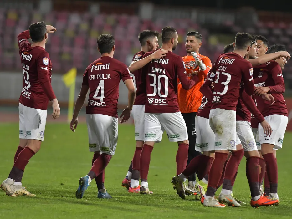Rares Andrei Ilie si Horatiu Alexandru Moldovan il felicita pe Alexandru Adrian Dandea dupa un gol marcat in meciul de fotbal dintre Academica Clinceni si Rapid Bucuresti, contand pentru Liga 1 Casa Pariurilor, desfasurat pe Stadionul Dinamo din Bucuresti, luni 8 noiembrie 2021. © FOTO:Razvan Pasarica/SPORT PICTURES