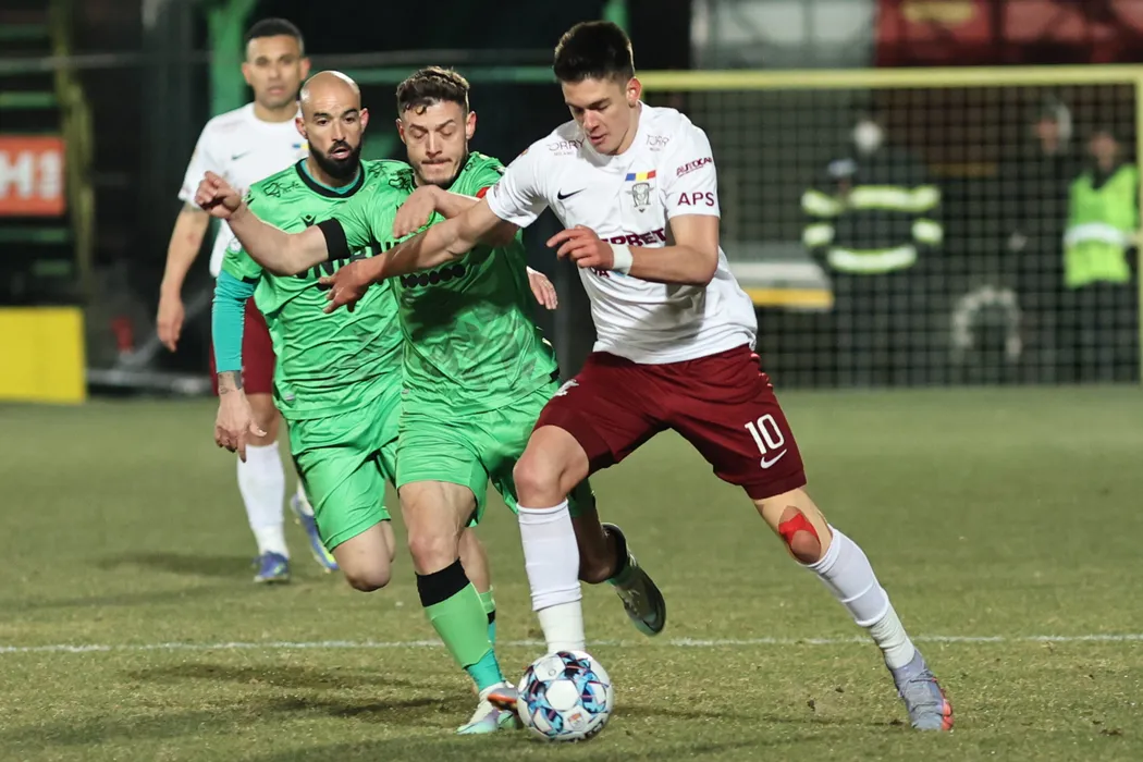 Echipele Rapid (echipament alb-visiniu) si Dinamo s-au intalnit intr-o partida din prima etapa a play-out-ului Ligii 1 de fotbal, duminica, 13 martie 2022, pe stadionul Rapid din Bucuresti. GEORGE FLUSTER / MEDIAFAX FOTO