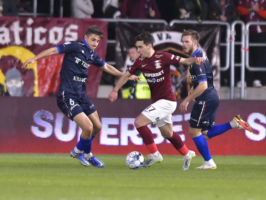 Victor Robert Dican, Rares Andrei Ilie si Denis Gratian Harut in meciul de fotbal dintre Rapid Bucuresti si FC Botosani, contand pentru Play-out-ul Ligii 1 Casa Pariurilor, desfasurat pe Stadionul Rapid Giulesti din Bucuresti, sambata 2 aprilie 2022. © FOTO:Razvan Pasarica/SPORT PICTURES