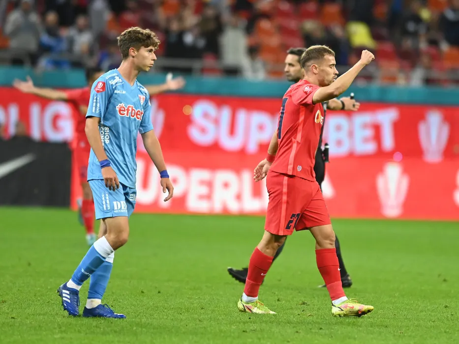 Darius Dumitru Olaru se bucura dupa un gol marcat /ssl/ Rares Mihai Pop in meciul de fotbal dintre FCSB si UTA Arad, contand pentru Superliga Superbet, desfasurat pe Arena Nationala din Bucuresti, duminica 16 octombrie 2022. © FOTO:Razvan Pasarica/SPORT PICTURES