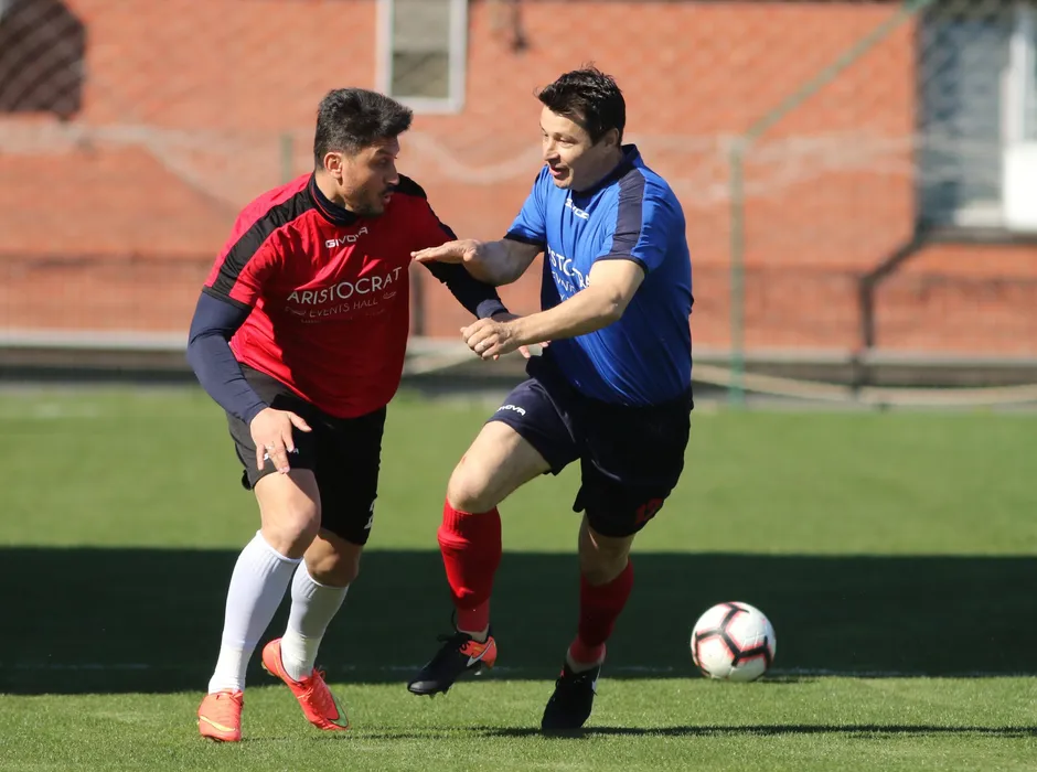 Ciprian Marica (S) si Iulian Miu (D) lupta pentru balon in timpul meciului caritabil Steaua - Dinamo, organizat de Liga Legendelor, care marcheaza 40 de ani de la debutul lui Ioan Andone in Liga 1, disputat pe stadionul Anghel Iordanescu din Voluntari, duminica, 24 martie 2019. Donatiile stranse in urnele amplasate in incinta stadionului vor fi directionate catre trei copii cu nevoi speciale din comuna Voluntari, dar si catre Kassandra Rotariu, fetita fotbalistului Iosif Rotariu, care urmeaza sa treaca printr-o noua interventie chirurgicala. GEORGE FILIP / MEDIAFAX FOTO
