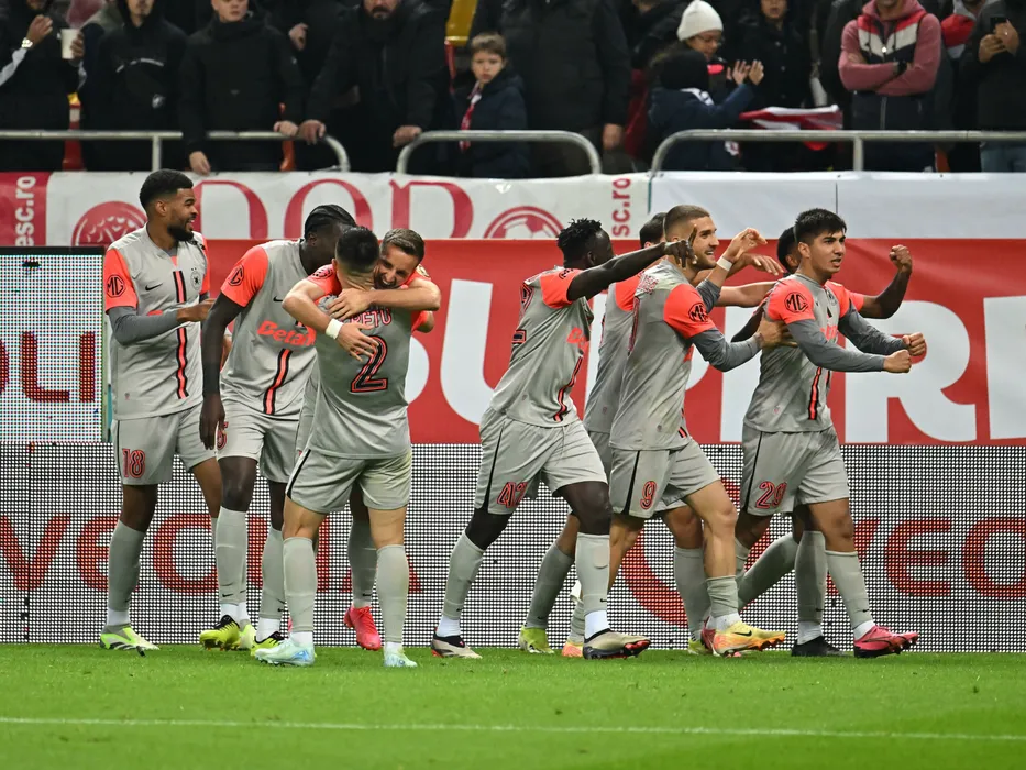 Bucurie a fotbaliștilor steliști Marius Ștefănescu, Malcolm Edjouma, Joyskim Aurelien Dawa Tchakonte si Alexandru Marian Musi după un gol marcat in meciul de fotbal dintre Dinamo Bucuresti si FCSB, contand pentru Superliga Superbet, desfasurat pe Arena Nationala din Bucuresti, duminica 20 octombrie 2024. © FOTO:Razvan Pasarica/SPORT PICTURES