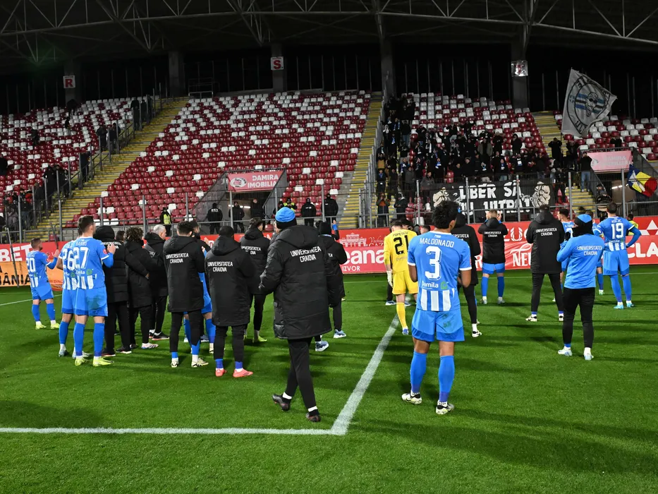Fotbaliștii craioveni salută galeria după meciul de fotbal dintre UTA Arad si Universitatea Craiova, contand pentru Superliga Superbet, desfasurat pe Stadionul Francisc Neuman din Arad, luni 25 noiembrie 2024. © FOTO:Razvan Pasarica/SPORT PICTURES