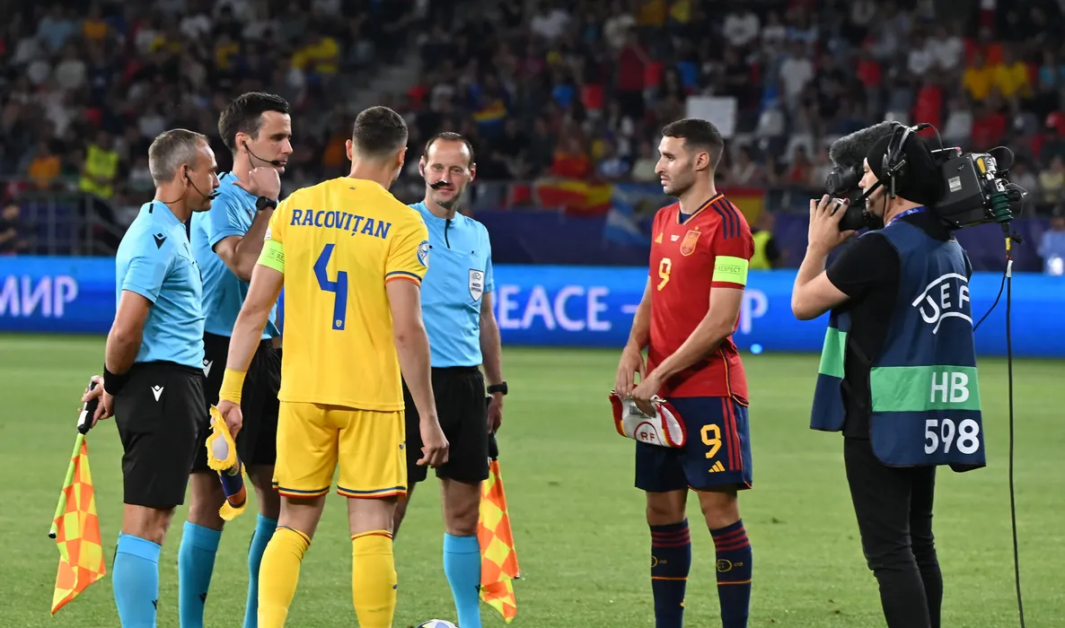Brigada de arbitri formata din Jo de Weirdt, Erik Lambrechts si Kevin Monteny alaturi de capitanii Bogdan Racovitan si Abel Ruiz in meciul de fotbal dintre Romania U21 si Spania U21, contand pentru Campionatul European U21, desfasurat pe Stadionul Steaua din Bucuresti, miercuri 21 iunie 2023.© FOTO:Razvan Pasarica/SPORT PICTURES