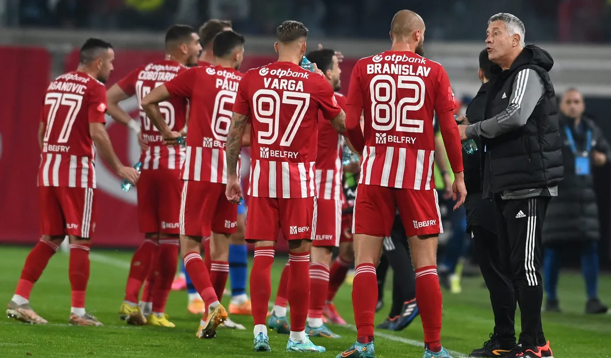 Fotbalistii de la Sepsi discuta cu antrenorul lor Cristiano Bergodi in meciul de fotbal dintre Sepsi OSK Sfantu Gheorghe si FCSB, contand pentru Superliga Superbet, desfasurat pe Sepsi Arena din Sfantu Gheorghe, luni 24 octombrie 2022. © FOTO:Razvan Pasarica/SPORT PICTURES