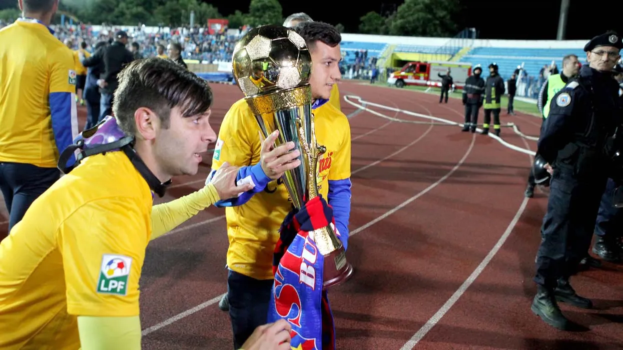 Raul Rusescu si Robert Vilceanu pozeaza cu trofeul.