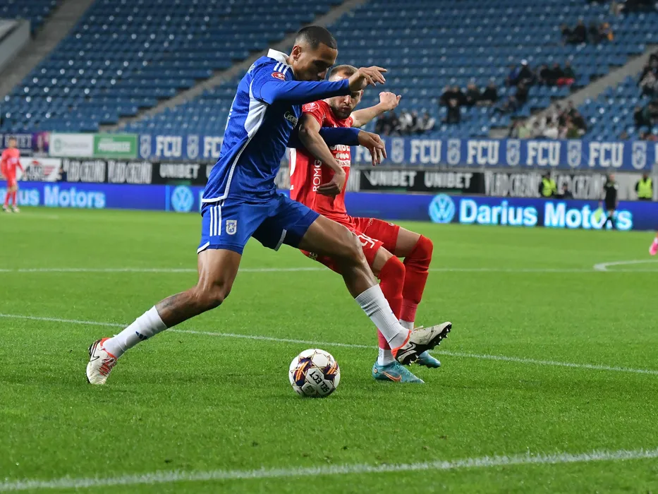 Leo Sebastien Lacroix și Silviu Nicolae Balaure în meciul de fotbal dintre FCU 1948 Craiova și AFC Hermannstadt Sibiu, contând pentru Superliga Superbet Play-Out, desfășurat pe Stadionul Ion Oblemenco din Craiova, duminică 12 mai 2024. © FOTO: Remus BADEA/SPORT PICTURES