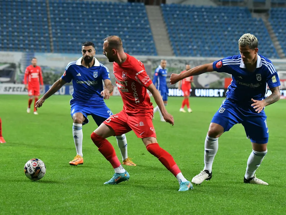 Silviu Nicolae Balaure și Yassine Bahassa, Raimundo Matheus Mascarenhas Dos Santos în meciul de fotbal dintre FCU 1948 Craiova și AFC Hermannstadt Sibiu, contând pentru Superliga Superbet Play-Out, desfășurat pe Stadionul Ion Oblemenco din Craiova, duminică 12 mai 2024. © FOTO: Remus BADEA/SPORT PICTURES