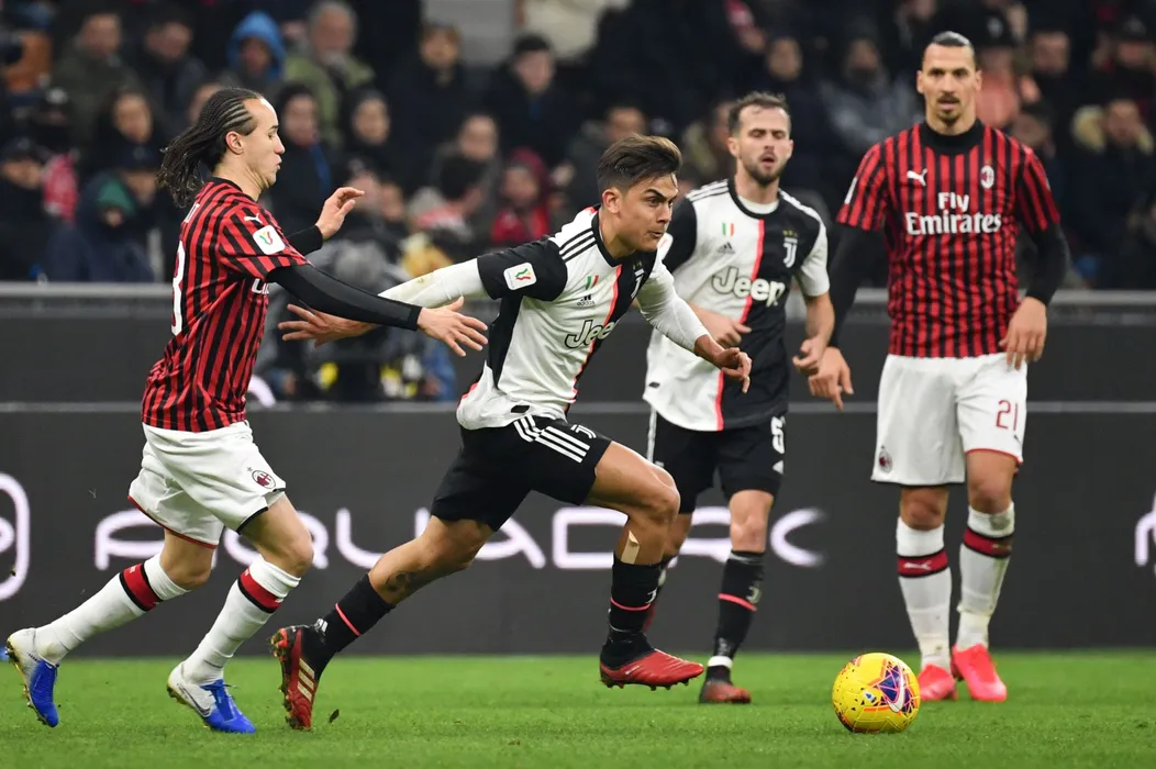 February 13, 2020, Milano, Italia: Foto Massimo Paolone/LaPresse .13 febbraio 2020 Milano, Italia .sport calcio .Milan vs Juventus - Coppa Italia 2019/2020 - Semifinale turno andata - stadio “Giuseppe Meazza”.Nella foto: Paulo Dybala (Juventus F.C.) in azione contrastato da Diego Laxalt (AC Milan) ..Photo Massimo Paolone/LaPresse .February 13, 2020 Milan, Italy .sport soccer .Milan vs Juventus - Italian Football Cup 2019/2020 - .Round semi-final - “Giuseppe Meazza” stadium. .In the pic: Paulo Dybala (Juventus F.C.) competes for the ball with Diego Laxalt (Credit Image: © Massimo Paolone/Lapresse via ZUMA Press)