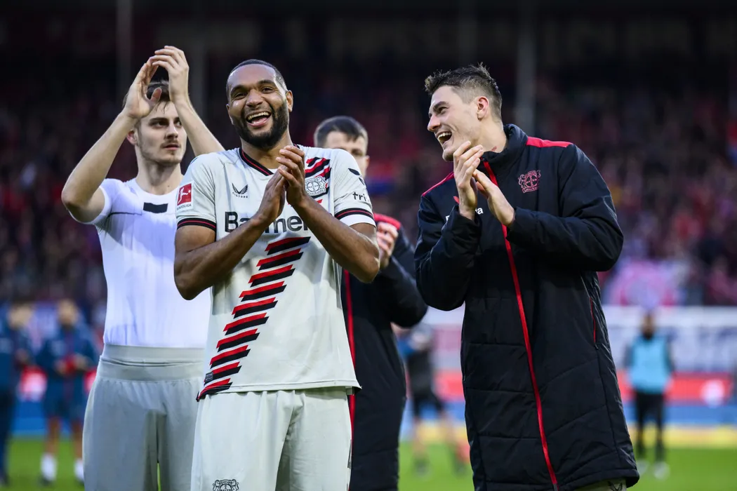 17 February 2024, Baden-Württemberg, Heidenheim: Leverkusen's Jonathan Tah (L) and Leverkusen's Patrik Schick thank the fans after the German Bundesliga soccer match between 1. FC Heidenheim and Bayer Leverkusen at the Voith-Arena. Photo: Tom Weller/dpa - IMPORTANT NOTICE: DFL and DFB regulations prohibit any use of photographs as image sequences and/or quasi-video.