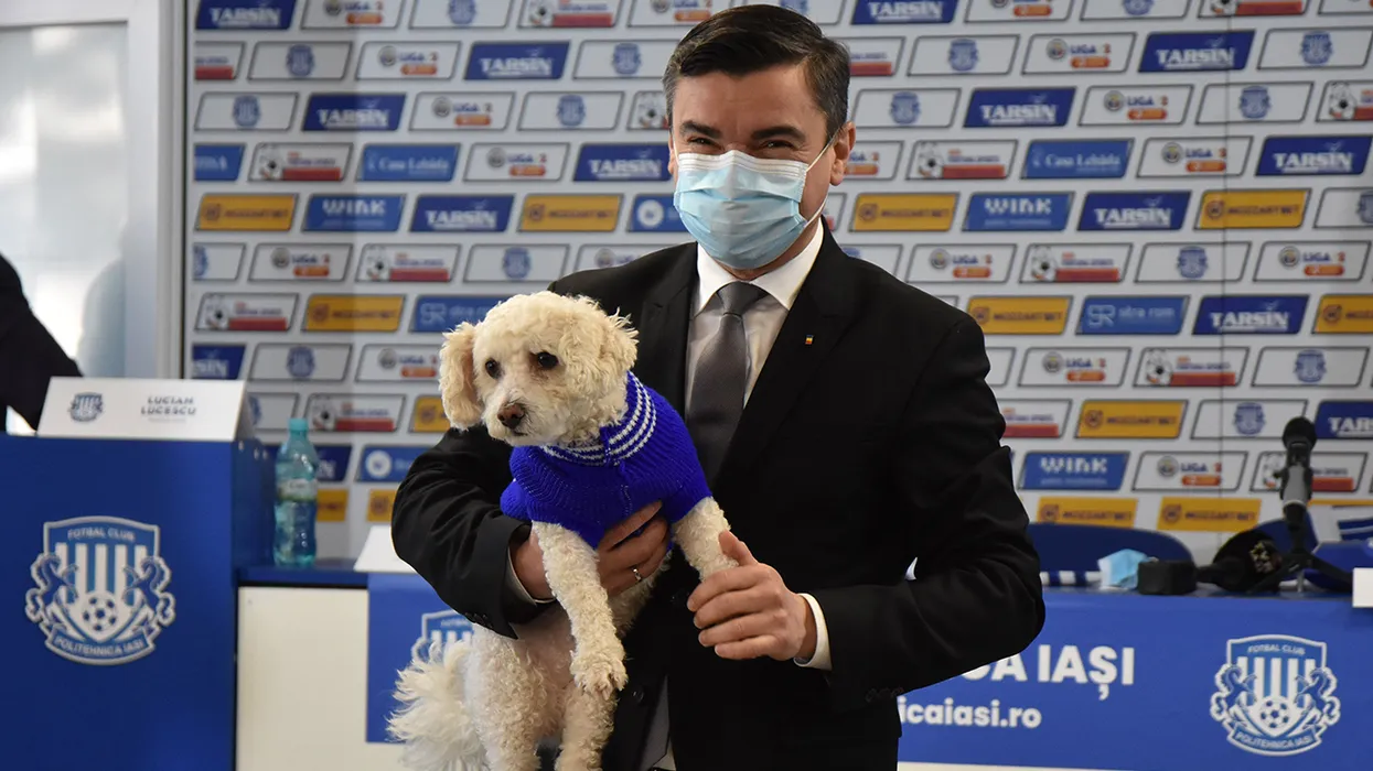 Primarul Mihai Chirica tine in brate un caine in timpul primei conferinte de presa a anului, conferinta sustinuta de conducerea clubului de fotbal Politehnica Iasi, miercuri, 12 ianuarie 2022. DRAGOS PASCANEANU / MEDIAFAX FOTO