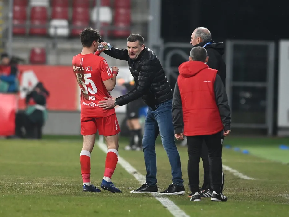 Laszlo Gyorgy Balint discuta cu Rares Mihai Pop in meciul de fotbal dintre UTA Arad si Farul Constanta, contand pentru Superliga Superbet, desfasurat pe Arena Francisc Neuman din Arad, vineri 24 februarie 2023. © FOTO:Razvan Pasarica/SPORT PICTURES
