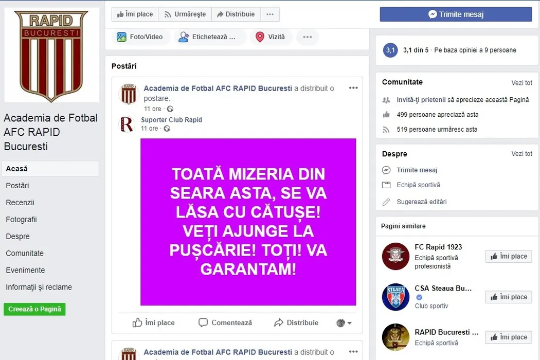 Războiul „rapizilor” pe Facebook: Rapidul susținut de PSD a reclamat și blocat paginile AFC Rapid – Manoliu și Rapid Frumoșii Nebuni – T2. Pagina AFC Rapid, rămasă de pe vremea FC Rapid, era urmărită de 170.000 de suporteri. Ce urmează