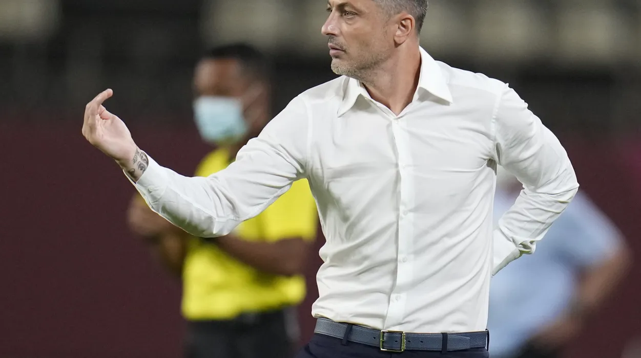 Coach Mirel Radoi of Romania gives instructions to his his players during a men's soccer match against South Korea at the 2020 Summer Olympics, Sunday, July 25, 2021, in Kashima, Japan. (AP Photo/Fernando Vergara)