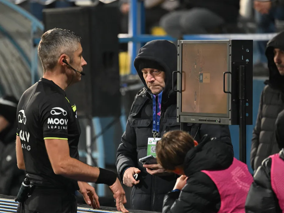 Arbitrul central Radu Petrescu consulta VAR-ul in meciul de fotbal dintre Farul Constanta si UTA Arad, contand pentru Superliga Superbet, desfasurat pe Stadionul central al Academiei Gheorghe Hagi din Ovidiu, luni 20 ianuarie 2025. © FOTO:Razvan Pasarica/SPORT PICTURES