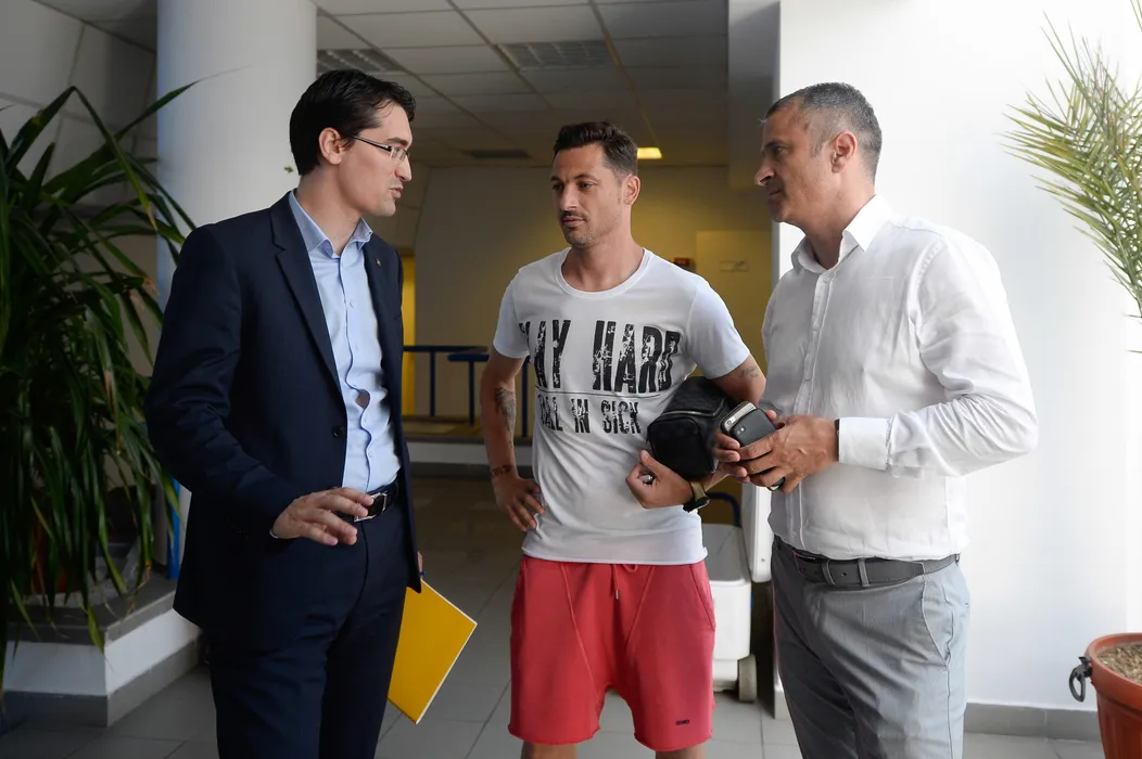 Presedintele FRF, Razvan Burleanu, discuta cu Mirel Radoi, la Centrul de Fotbal Mogosoaia, joi, 23 iulie 2015. OCTAV GANEA / MEDIAFAX FOTO