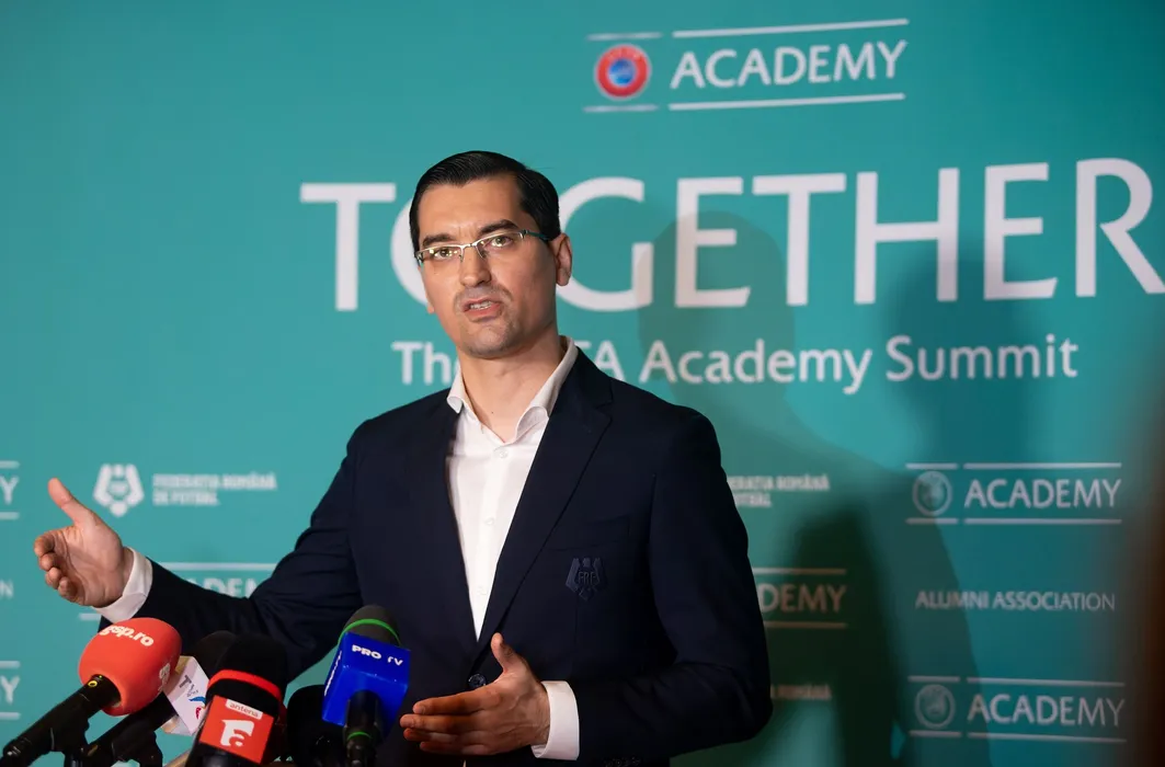 Razvan Burleanu, president of the Romanian Football Federation (FRF), speaks during a press conference at the end of the two days of the UEFA Academy Summit, September 22 and 23, an event with 300 guests organized for the first time and dedicated to graduates of the UEFA Academy courses.