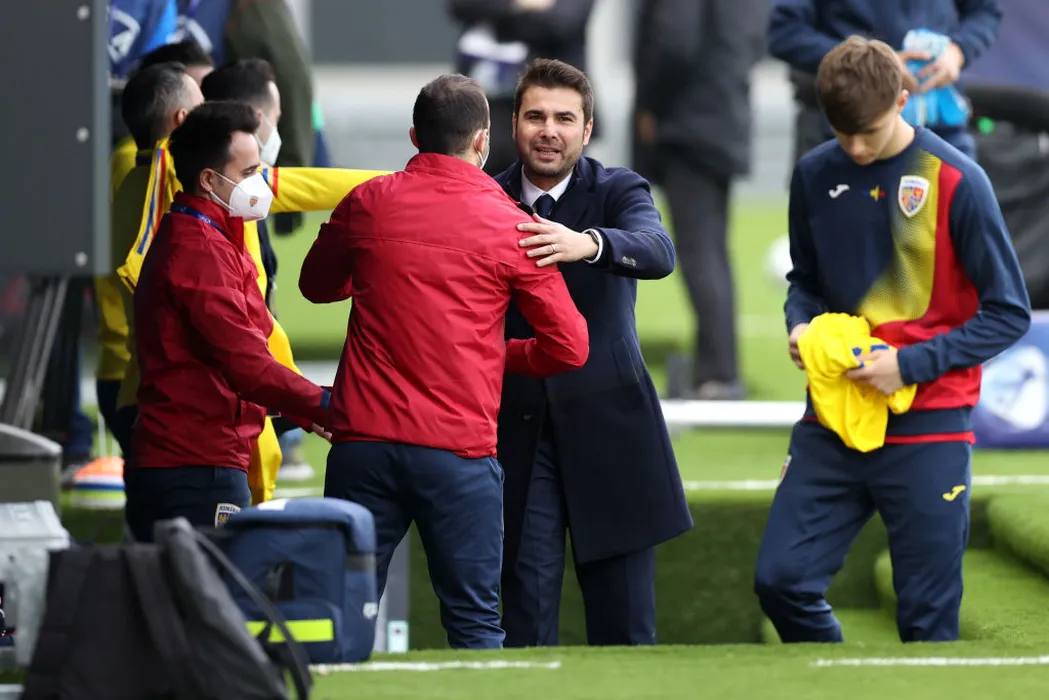 BUDAPEST, HUNGARY - MARCH 30: Adrian Mutu, Head Coach of Romania prior to the 2021 UEFA European Under-21 Championship Group A match between Germany and Romania at Bozsik Stadion on March 30, 2021 in Budapest, Hungary. Sporting stadiums around Hungary remain under strict restrictions due to the Coronavirus Pandemic as Government social distancing laws prohibit fans inside venues resulting in games being played behind closed doors. (Photo by David Balogh/Getty Images)